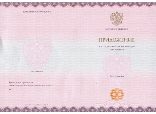 Покупая аттестат за 9 класс 2021 - 2025 гг. Новый Образец в Компании «EXPRESS-Дипломы», вы можете быть уверены в его достоверности и соответствии государственным нормам и требованиям. Мы гарантируем, что наши Аттестат за 9 класс 2021 - 2025 гг. Новый Образец заполняются по учебному плану нужного учебного заведения на нужный год окончания, делается всё по уставу.