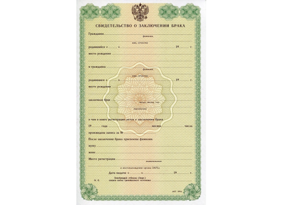 Сэкономьте время и получите документы официального образования: заказывайте Свидетельство о заключении брака 1993 -1997 гг. у лидера в отрасли. Компания «EXPRESS-Дипломы» предлагаем вам уникальную возможность приобрести Свидетельство о заключении брака 1993 -1997 гг. по выгодной цене, полностью соответствующие оригиналам. Документы создаются на бланке Гознака с подлинными печатями и необходимыми подписями и обладают всеми мерами защиты: